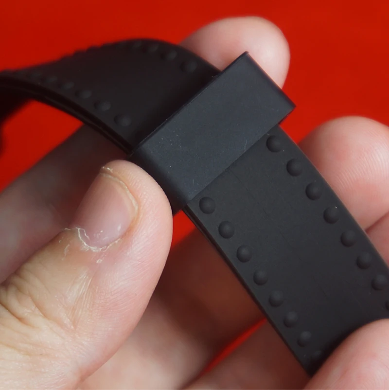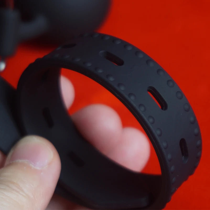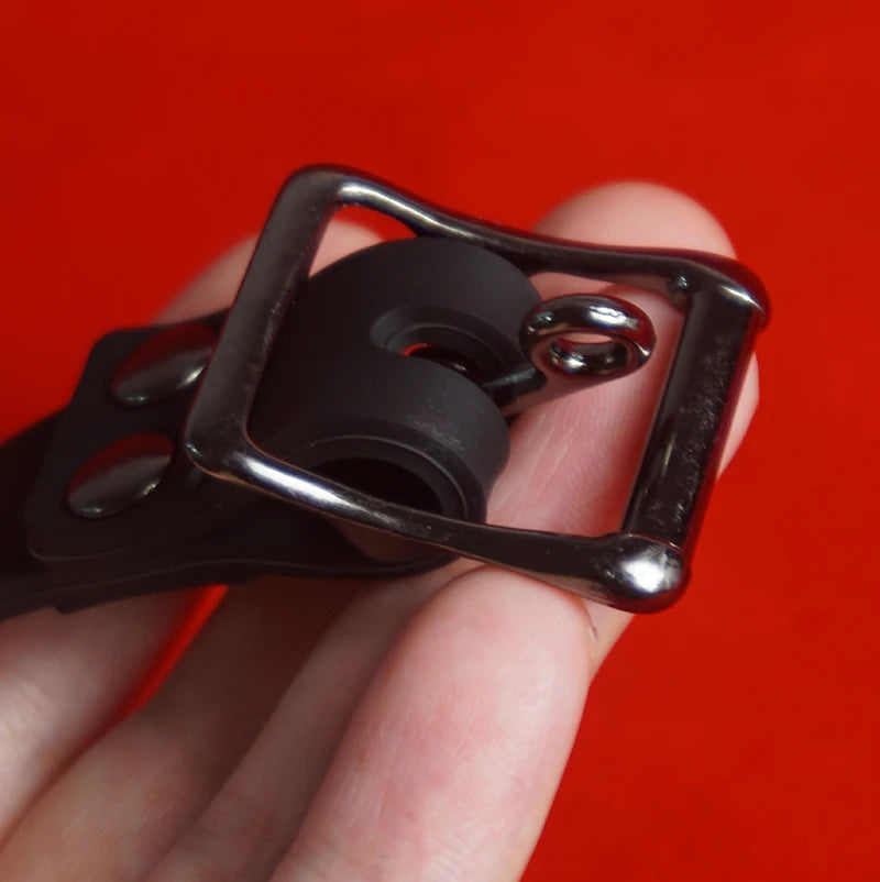 Der Mundball ist an zwei seitlichen Bändern befestigt, die mit O-Ringen als Haken versehen sind.