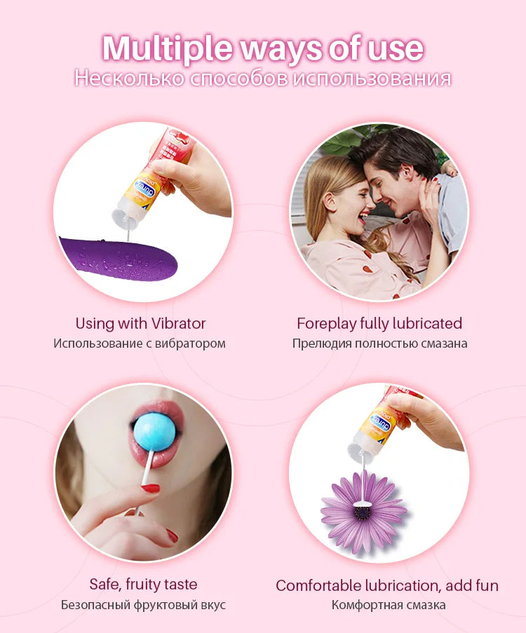 Warming, Feel, Strawberry, Cherry und Aloe sind fünf Geschmacksrichtungen wasserlöslicher Gleitflüssigkeiten, die dauerhaft feuchtigkeitsspendend und leicht zu reinigen sind