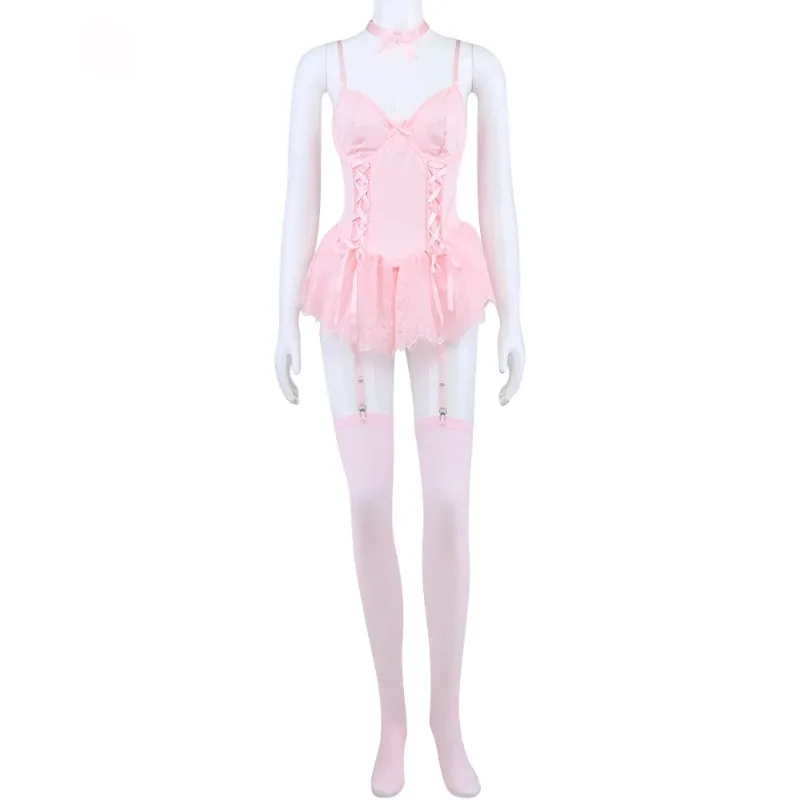 „Das komplette Set umfasst Korsett, Tanga, Strümpfe und verstellbare Träger – entwickelt für nahtlose Rollenspiele oder Boudoir-Eleganz.“