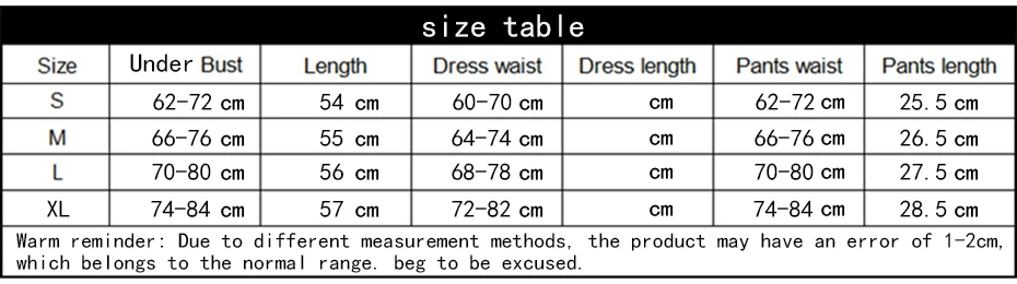 S:bajo busto:62-72 cm,largo:54 cm,cintura:60-70 cm,cintura del pantalón:62-72 cm,largo del pantalón:25,5 cm;